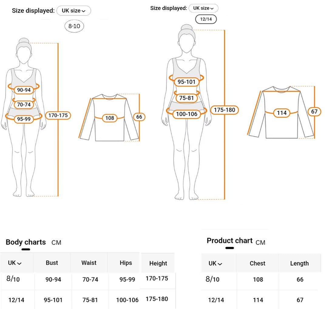 Currently offering two women's UK size options: 8-10 or 12-14. Please see the size guide (all measurements are in cm) and take measurements if you are unsure.