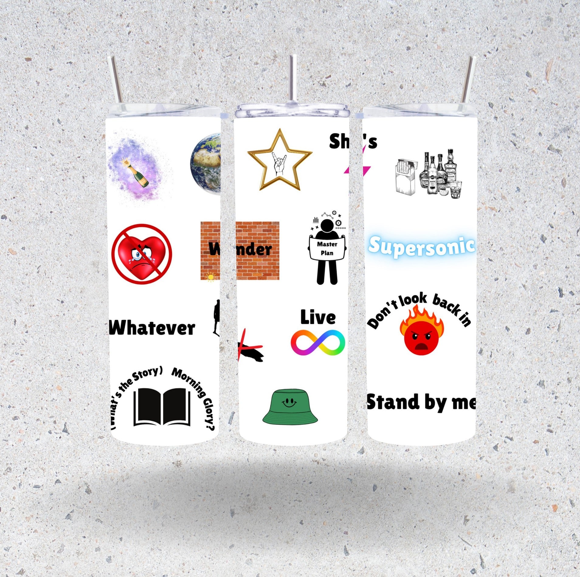 - This is an Oasis-inspired drinks tumbler, with graphics to represent some of their most beloved songs.