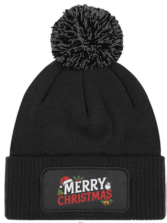 Merry Christmas Beanie Knitted Winter Bobble Hat Unisex Festive Seasonal