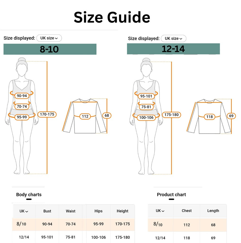 Currently offering two women's UK size options: 8-10 or 12-14. Please see the size guide (all measurements are in cm) and take measurements if you are unsure.