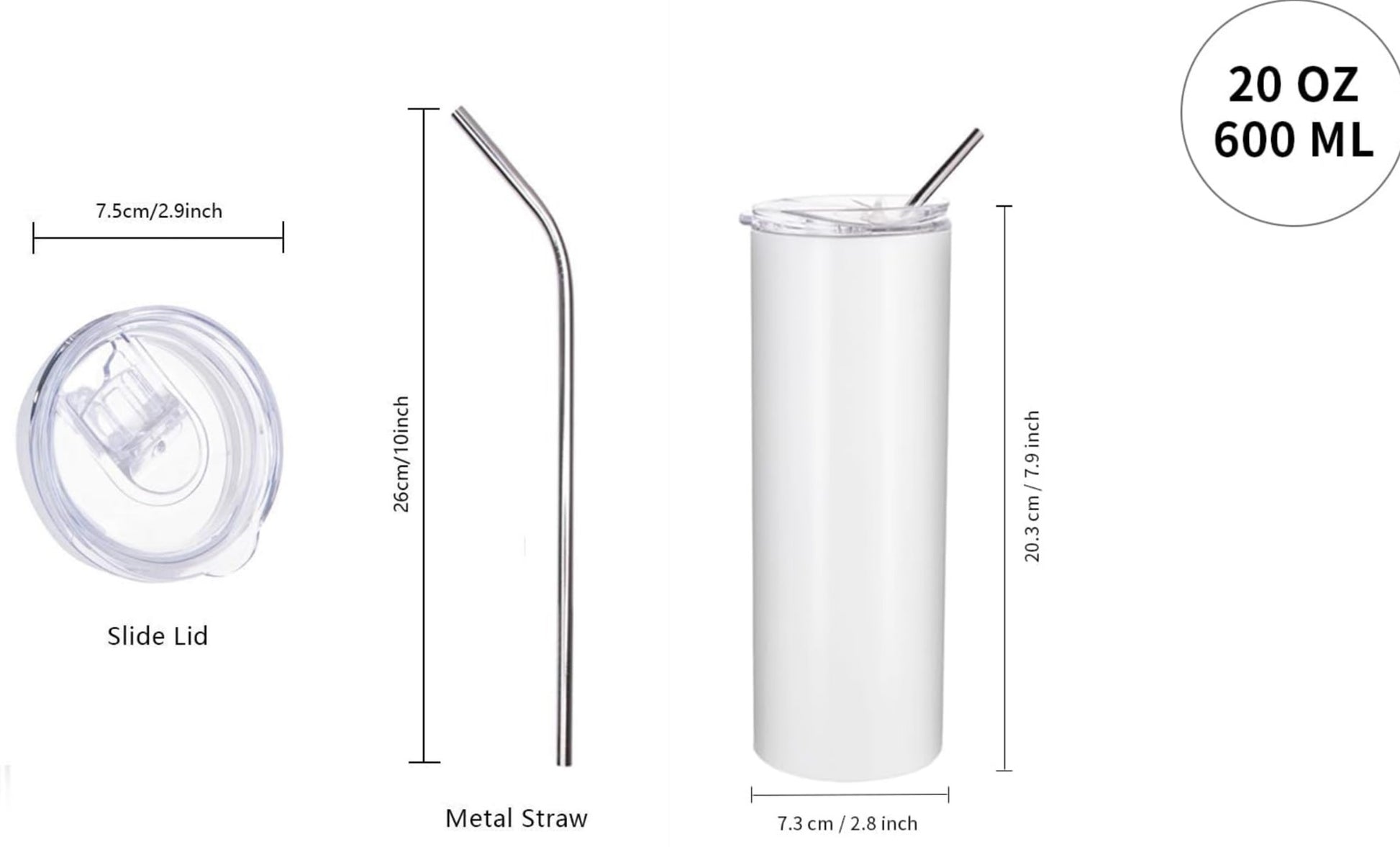 - 20 OZ/ 600 ML. 20cm x 7cm. It comes with a rubber-sealed slide lid and metal straw.
