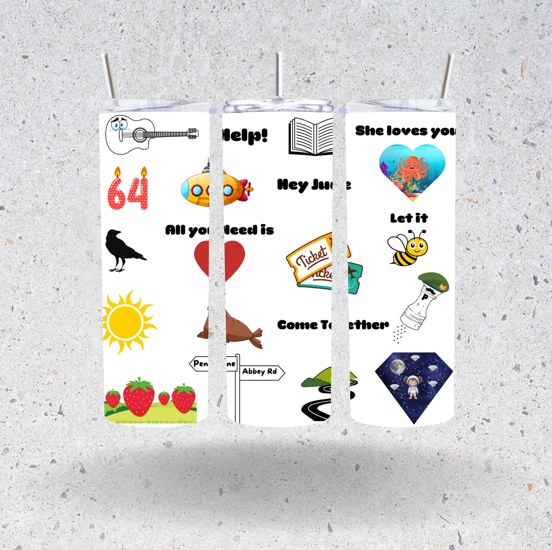 - This is a Beatles-inspired drinks tumbler, with graphics to represent some of their most beloved songs.
