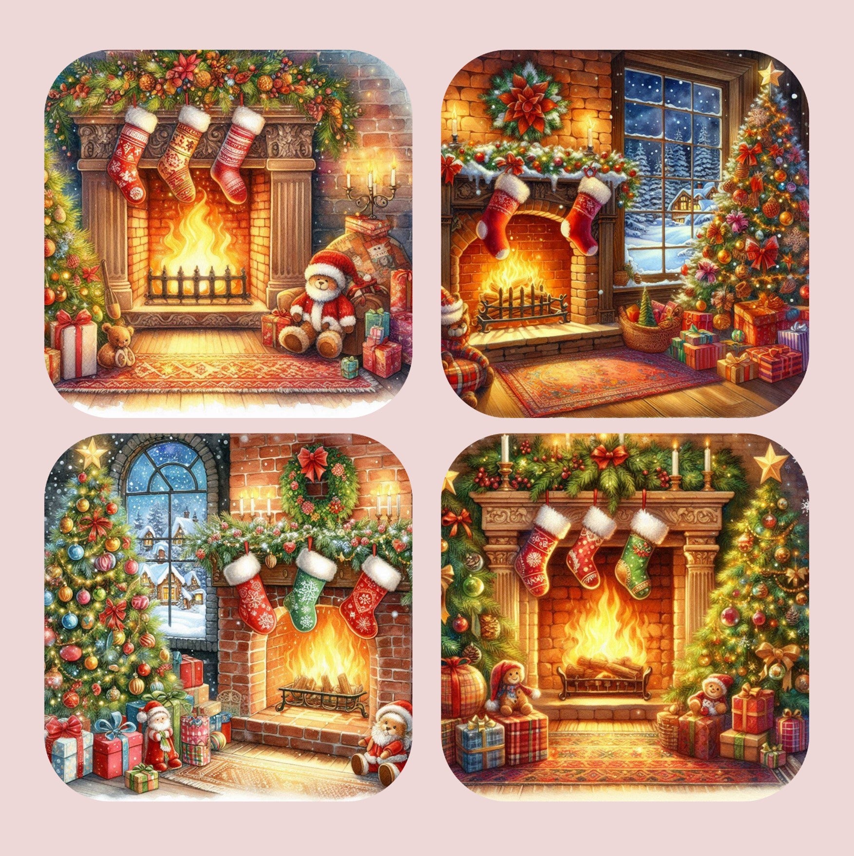 This set of 4 Traditional Christmas Fireplace Coasters will be a festive addition to your home décor.